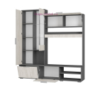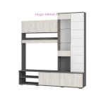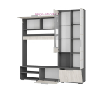 Центральная секция гостиной шириной 2 метра которая при необходимости может быть дополнена платяным шкафом. Стенка в гостиную представляет собой готовый комплект состоящий из ТВ тумбы, витрины со стеклом и закрытого пенала с полками. Закрытые и открытые полки подходят для хранения посуды, книг и предметов интерьера. Закрытый пенал декорирован стеклом белого цвета лакобель. Верхние и нижние закрытые полки гостиной откидные.