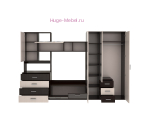 - Центральная секция оснащена комодом, тумбой под ТВ, стеклостворкой под книги или посуду и полками под различные мелочи;