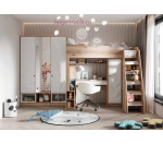 Кровать продается в комплекте с удобной лестницей, угловым шкафом и открытыми полками для хранения. Мебель для детской Киви с белыми матовыми фасадами подходит для мальчиков и девочек благодаря современному сочетанию цветов и рельефному рисунку в виде пазла на фасадах.