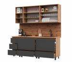 Недорогая кухня Хелен серого цвета с корпусом под дерево длиной 2 метра представляет собой готовый к монтажу комплект кухонной мебели. В стоимость кухонного гарнитура входит цельная столешница "Дуб вотан" толщиной 38 мм. В комплект входят 6 кухонных шкафов, три верхних и три нижних, размеры  секций 40, 80 и 80 см.