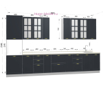 Кухня длиной 3.8 метра с высокими верхними шкафами и пеналом для встраиваемой духовки. Фасады кухни из МДФ, покрытие матовое с тиснением под дерево в цвете графит. Шкафы с матовыми стеклами и расстекловкой. Кухня "Мария" модульная и её размеры можно изменить исходя из особенностей планировки, можно добавить шкаф для вытяжки, увеличить количество ящиков, купить антресоли для кухни и увеличить высоту кухонного гарнитура. Для расчета стоимости кухни на заказ обращайтесь к менеджерам магазина.