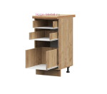 В комплектацию входит: корпус, фасад, ручки, фурнитура для сборки, пластиковые регулируемые ножки, нижний цоколь из ЛДСП. Кухонный шкаф нижний с тремя ящиками продаётся без столешницы, схема сборки кухонного шкафа в комплекте.