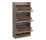 Недорогая обувница Ева с тремя отделениями для обуви и открытой полкой. Высокая обувница с откидными полками и металлическими ручками подходит для небольших прихожих.
