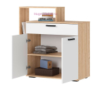 Недорогой комод с вместительным выдвижным ящиком, закрытой полкой и открытыми нишами. Комод шириной 1 метр с фасадами белого цвета и светлым корпусом под дерево.