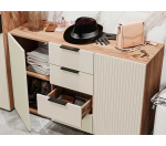 Вместительный комод шириной 120 см подходит для любого помещения, включая прихожую, гостиную и спальню. Комод представляет собой универсальную систему хранения: 4 выдвижных ящика для одежды и аксессуаров и две закрытые секции с полками. Створки комода открываются нажатием, ящики с надежной системой полного выдвижения. Современное сочетание матовых фасадов из МДФ сливочного цвета и декора под дерево помогут вписать комод в любой интерьер.
