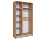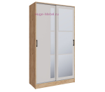 Недорогой шкаф купе шириной 120 см и высотой 220 см с двумя раздвижными дверьми и зеркалом. Внутри шкафа стационарная штанга и отсек с полками. Зеркала с фацетной обработкой. Компактный шкаф-купе выпускается фабрикой в нескольких цветовых решениях, в том числе в сочетании светлого кремового цвета кашемир и древесного декора дуб крафт золотой.