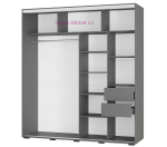 Современный вместительный шкаф купе шириной чуть меньше 2 метров. Шкаф в цвете графит серый с двумя дверями купе: зеркальной и дверью со стеклом белого цвета. Внутри шкафа два отделения: штанга для одежды 95 см и отсек с полками. Отделение с полками разделено на две части по 47 см: 5 полок для вещей и три полки с двумя выдвижными ящиками. Внутри шкафа-купе есть дополнительные полки наверху. Высота шкафа 2.15 метра подходит практически для любых квартир.