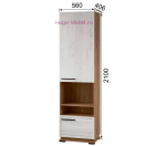 Шкаф пенал шириной 56 см с открытой нишей высотой 35, 5 см и закрытыми полками. Пенал в сочетании древесных оттенков дуб крафт табачный и крафт белый с черными металлическими ручками. Шкаф пенал подходит для гостиной и спальни Модена в том же цвете. Нижний откидной рамочный фасад декорирован планками из МДФ разной ширины.