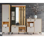 Шкаф пенал с полками и открытой нишей Милан с фасадами светло бежевого цвета кашемир и корпусом под дерево золотистого цвета. За распашной своркой пенала 2 полки ( 3 отделения), нижняя дверца пенала откидная. Открытую нишу шкафа можно дополнить полкой-кубом под цвет корпуса или оставить нишу со стандартной задней стенкой белого цвета. Пенал входит в серию модульной прихожей Милан.
