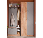 Распашной 2-створчатый шкаф Орегон шириной 80 см со штангой и полками для одежды. Небольшой шкаф для одежды подходит для прихожей, гостиной и спальни и сочетается с другой мебелью серии Орегон. Корпус шкафа выполнен в теплом оттенке дерева, матовый фасад серого цвета из МДФ с фрезеровкой в виде ассиметричных линий. Шкаф без зеркала, высота 210 см, ширина полок 38 см, длина штанги для одежды 36,8 см.