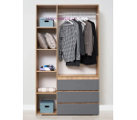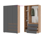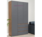 Недорогой трёхстворчатый шкаф Хелен ШК 06 с тремя выдвижными ящиками без зеркал. Шкаф шириной 120 см в современном сочетании серого цвета и отделки под дерево. Внутри шкафа два отделения: двумя распашными створками неполной высоты, открывающиеся захватом снизу, хромированная штанга для одежды, внизу — три ящика полного выдвижения. Боковая секция шкафа с полками выполнена в виде глухого пенала и открывается нажатием с помощью толкателя.