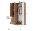 Современный 3-х створчатый шкаф с зеркалом и тремя выдвижными ящиками. Шкаф для одежды шириной 120 см с двумя отделениями внутри: отсек шириной 76 см со штангой для одежды и антресольной полкой и отделение с двумя полками шириной 38 см с тремя выдвижными ящиками внизу. Фасады с оригинальной фрезеровкой из МДФ с качественным матовым покрытием белого цвета, корпус под дерево в цвете дуб крафт табачный.