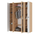 Недорогой четырехстворчатый шкаф для одежды с зеркалами. Внутри шкафа три отделения: два отсека с полками слева и справа и центральный отсек со штангой для одежды на плечиках и двумя полками. Шкаф шириной 160 см с фасадами белого цвета и корпусом под дерево. Шкаф можно дополнить другой мебелью для спальни, гостиной и прихожей из серии Санса.