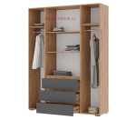 Вместительный 4-х створчатый шкаф с тремя выдвижными ящиками, ширина шкафа 160 см. Внутри шкафа 3 отсека: два отделения со штангой и отделение с полками. Выдвижные ящики на шариковых направляющих полного выдвижения. Шкаф входит в серию мебели Хелен и может быть дополнен пеналом, комодом или стеллажом в том же стиле. Мебель Хелен выпускается в двух цветах помимо серого: полностью белом и сочетании белого и дуба крафт.
