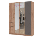 Вместительный четырехстворчатый шкаф шириной 160 см с двумя зеркальными створками и тремя выдвижными ящиками. Шкаф в сочетании теплого оттенка дерева крафт табачный со створкой серого цвета с геометричным рисунком. Внутри шкаф разделен на три отсека6 за центральными створками штанга для одежды шириной 76 см, слева 3 выдвижных ящика и 2 полки шириной 38,4 см, справыа отделение с 4 полками разной высоты. Шкаф Орегон вмещает достаточно обширный гардероб и сочетается с комодом, шкафами и пеналами из той же серии.